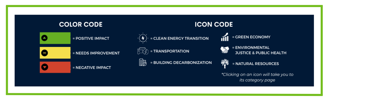 NetZeroMA.org tracks climate decisions through two categories. Our color code indicates the impact a decision has on our progress, and our icons indicate the issue area affected.